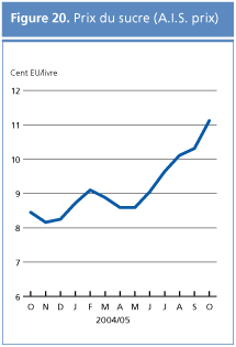 Le raffermissement des cours mondiaux du sucre s'est poursuivi en 2005; le prix de l'Accord international sur le sucre (ISA) a atteint en moyenne 9,20 cents EU par livre et par jour de janvier à septembre, soit une augmentation de plus de 30 pour cent par rapport à la même époque en 2004. Cette augmentation a été soutenue par une forte croissance de la consommation alors que celle de la production s'est ralentie, ce qui a entraîné une diminution des réserves mondiales. Compte tenu de la stabilité relative des prix ces deux derniers mois, il est probable que le marché a déjà pris en compte la plupart des changements des indicateurs de base du marché pour la campagne 2005/06, et à moins d'une rupture des approvisionnements, les prix devraient rester fermes et stables.