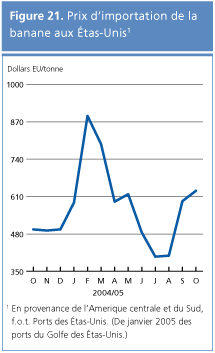 Les marchés de la banane se sont caractérisés par des prix élevés au cours du dernier trimestre 2005, en particulier aux États-Unis et dans l'UE. Cette situation s'explique par la conjugaison d'une demande ferme et d'une offre réduite. La production de la banane a souffert des mauvaises conditions météorologiques en Amérique latine. Plus précisément, une série d'ouragans et de tempêtes tropicales ont dévasté les plantations au Guatemala, au Mexique et au Honduras, tandis que des pluies violentes se sont abattues sur le Panama. La hausse des prix du pétrole a aussi contribué à l'augmentation des prix à l'importation. Dans l'UE, l'augmentation a été encore accentuée par la moindre production intérieure et l'insuffisance des licences d'importation. Les prix à l'importation ont atteint leur plus haut niveau depuis les années 1990. En ce qui concerne les premiers mois de 2006, il semble que la situation actuelle se maintiendra, à savoir des disponibilités tendues et des prix élevés.
