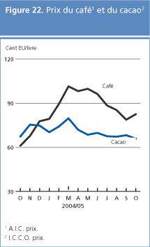Les cours mondiaux du cacao ont augmenté en septembre 2005, passant à 67,22 cents EU la livre, mais ils sont retombés à 65,9 cents EU en octobre suite aux estimations laissant entrevoir une augmentation des exportations en Côte d'Ivoire. De janvier à octobre 2005, les prix ont avoisiné en moyenne 70 cents EU la livre, en très légère hausse par rapport à la même époque en 2004. Trois grands mouvements ont caractérisé l'évolution des prix jusqu'à présent en 2005. De janvier à mars, les prix ont augmenté de 13,5 pour cent, passant à 79,7 cents EU la livre sous l'effet des interrogations quant à un éventuel déficit de l'offre en 2005/06; ensuite, de mars à mai, les prix ont accusé une tendance à la baisse pour s'établir à 68,5 cents EU la livre en mai. Ils sont restés relativement stables de mai à octobre, avoisinant 67,8 cents EU la livre de mai à octobre, soit une baisse de 3,5 pour cent par rapport aux prix constatés en début d'année. Outre la fermeté du dollar EU, le recul global des prix depuis le début de l'année reflète les inquiétudes quant à l'excédent estimatif de la production mondiale pour la campagne 2005/06, du fait que les principaux pays consommateurs ne devraient que modérément accroître leur consommation. Les dernières estimations laissent entrevoir un excédent mondial de 70 000 tonnes pour la campagne 2005/06, qu'il convient de comparer avec l'estimation révisée de 2004/05, à savoir un déficit d'environ 42 000 tonnes.