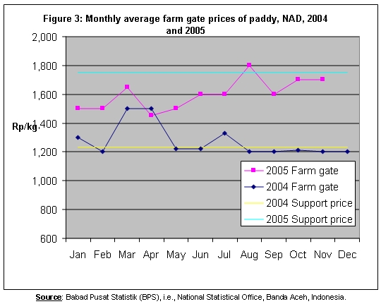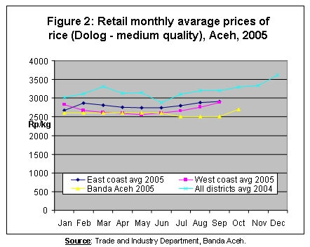 Food markets, disrupted with loss of physical infrastructure and most commodity stocks in most costal areas during the tsunami disaster, have resumed their activities. Rice and most other food items are readily available in most markets at fairly competitive prices. The average 2005 (Jan-Sep) rice price was lower by 12 percent than the corresponding price in 2004. This is mainly due to the reduced purchasing power, reduced effective demand this year following the tsunami disaster and the decline of the rice quality. However, based on the official data, the farm gate prices of rice have remained higher in 2005 compared with prices in 2004 mainly due to the higher support price by Bulog (the Government procurement agency). The mission also found that the average price of rice on the east coast in 2005 was slightly higher, by about Rp. 200/kg (about US 2 cents), than the corresponding price on the west coast, primarily due to an easier access by road and higher demand on the east coast from the main trading centre of Medan.