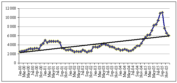 Overall, the Mission estimates the total cereal production from the whole of Sudan for 2005/06 at about 5.29 million tonnes, comprising 4.07 million tonnes of sorghum, 663 000 tonnes of millet, 120 000 tonnes of maize, 35 000 tonnes of rice and a forecast of 400 000 tonnes of wheat (to be harvested in April/May 2006). This represents an increase of 55 percent over the previous year’s poor crop and about 17 percent over the average for the previous five years. In anticipation of an adequate harvest, cereal prices throughout the country began to fall significantly in November from the record high prices reached during the summer months of 2005 are now about 50 percent below the peak levels. Still in many States prices are almost double the long-term monthly average. Pasture and water supplies are satisfactory over most of the country and livestock health is good. Livestock prices have begun to rise slightly in response to the favourable conditions.