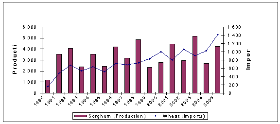 Again another year without significant pest and disease attacks has not added particular problems. Given that the main sorghum harvest is yet to occur market presentations of sorghum were low and prices are comparatively high at 4 000 SDs per 90 kg sack but have begun to fall in recent weeks.