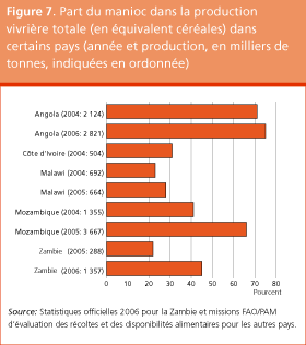 Les données disponibles sur la production de manioc dans la plupart des pays d'Afrique sont partielles et inexactes. Toutefois, sur la base des estimations officielles approximatives des superficies cultivées, les statistiques montrent que dans plusieurs pays, la production de manioc représente une part considérable de la totalité des approvisionnements alimentaires (voir la figure ci-dessous)