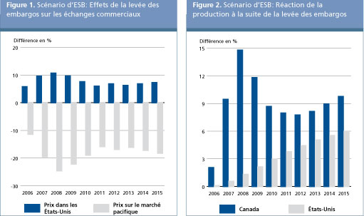 Notes: les diagrammes montrent la différence en pourcentage entre une situation de base dans laquelle les embargos à l'égard de l'Amérique du Nord sont maintenus et un scénario prévoyant la levée de ces interdictions.