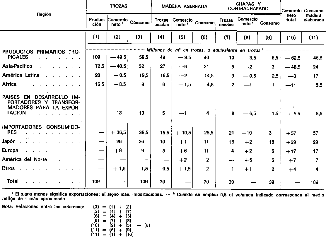 Puede verse rápidamente el papel mas predominante de las especies de coníferas, pero es claro que las especies latifoliadas aumentan en importancia y que, en particular, para las latifoliadas tropicales, su importancia crece aún más rápidamente. Esto está sucediendo a pesar de que las especies latifoliadas tropicales no han jugado todavía un papel muy importante en la subclase de maderas industriales que crece más rápidamente: en la materia prima para pastas y en la fabricación de tableros aglomerados y de fibra. Ello está en cierto modo compensado en las regiones templadas por la reducción en el empleo de postes, ademes, etc.