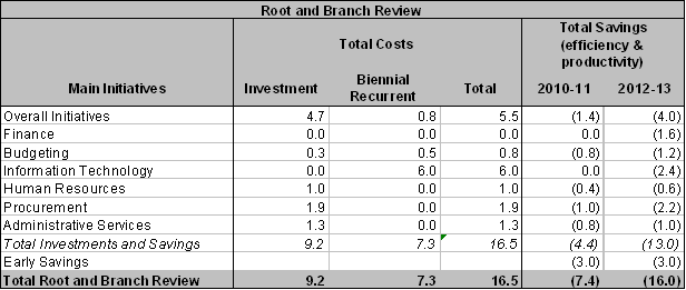 12) Table 6 provides an overview of the cost and savings estimates stemming from the Root and Branch Review. Total investment and recurring costs are estimated at approximately USD 16.5 million (with USD 9.2 in investment costs and USD 7.3 million in biennial recurrent costs).