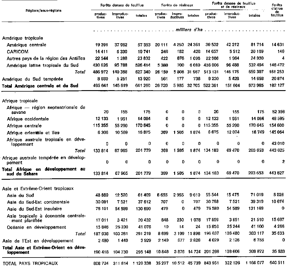 · Pour avoir une idée d'ensemble de l'évolution du couvert forestier tropical dans le monde' il faut ajouter à la destruction des forêts denses celle des forêts claires; bien qu'aucune estimation précise n'ait été faite, un bref examen montre que cette destruction porterait sur plus de 70 millions d'ha entre 1975 et 2000 (plus de 33 millions d'ha en Amérique tropicale, plus de 31 millions d'ha en Afrique tropicale et plus de 6 millions d'ha dans les pays tropicaux d'Asie et d'Extrême-Orient).