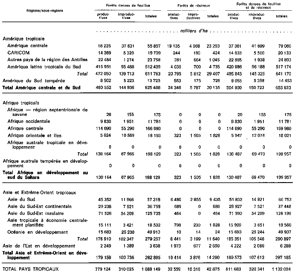 Forêts de résineux. En 1975 l'Amérique centrale et l'Amérique du Sud possédaient 70 pour cent des forêts tropicales de résineux (32 millions d'ha sur un total mondial de 45,7 millions) et 74 pour cent des forêts tropicales de résineux exploitables (26,2 millions d'ha sur 35,2 millions). Ces forêts se trouvent principalement en Amérique centrale et aux Antilles, bien que le sud-est du Brésil en compte 5 millions d'ha auxquels il faut ajouter 100000 ha de peuplement de Podocarpus dans les Andes (cette espèce étant souvent associée aux feuillus). La plupart de ces forêts ne peuvent être considérées comme faisant l'objet d'un aménagement intensif, plusieurs d'entre elles ont déjà été exploitées et ne sont souvent pas en mesure d'assurer une production soutenue. Les pays tempérés d'Amérique du Sud possèdent environ 0,7 million d'ha de forêts naturelles de résineux situées dans la région méridionale des Andes dont environ 25 pour cent ne sont pas exploitables.