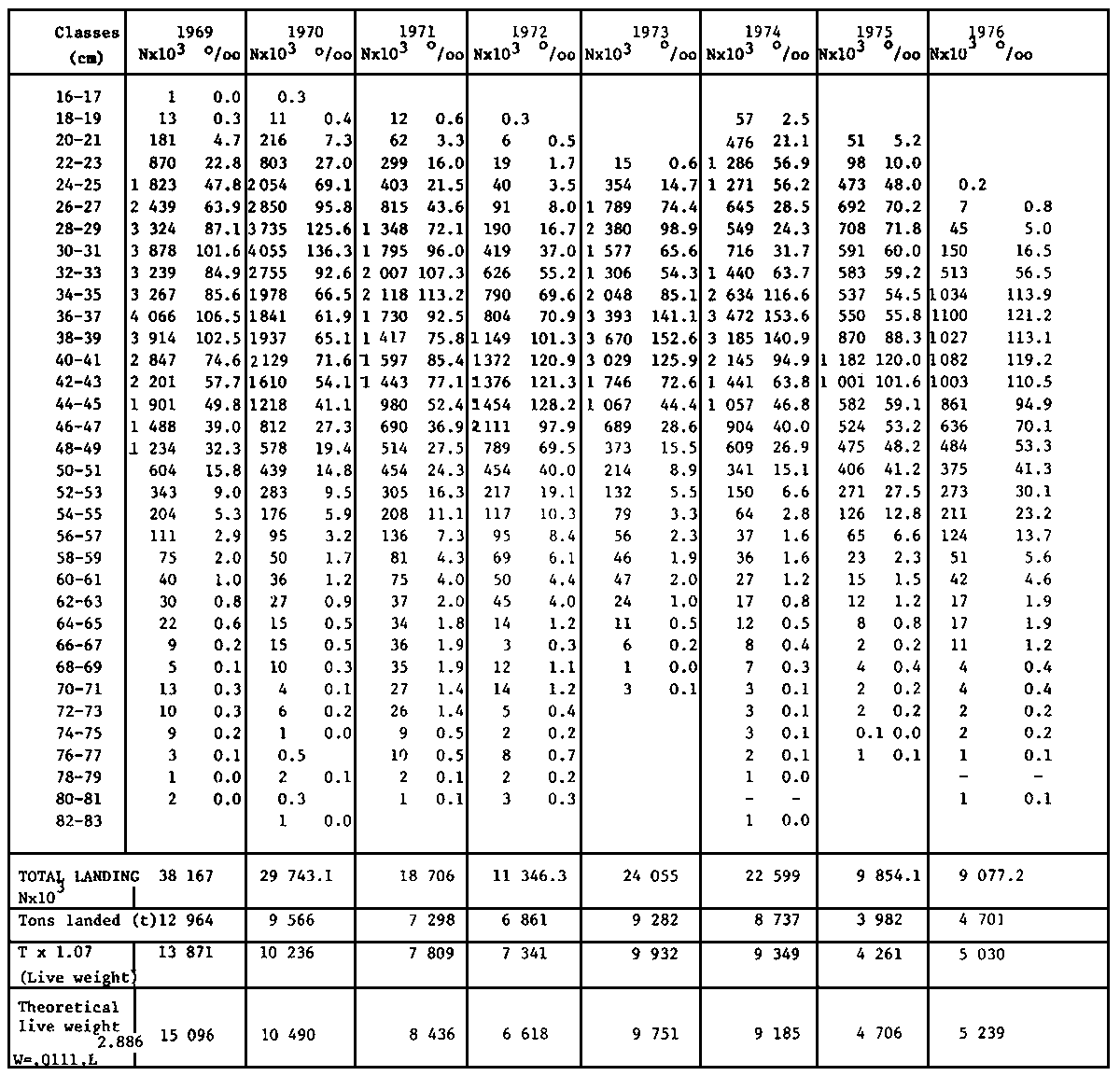 Monteiros (1969) length/weight relationship W =.0111 × L2.886 was applied to numbers of fish to obtain the theoretical live weight as a check on the live weight.