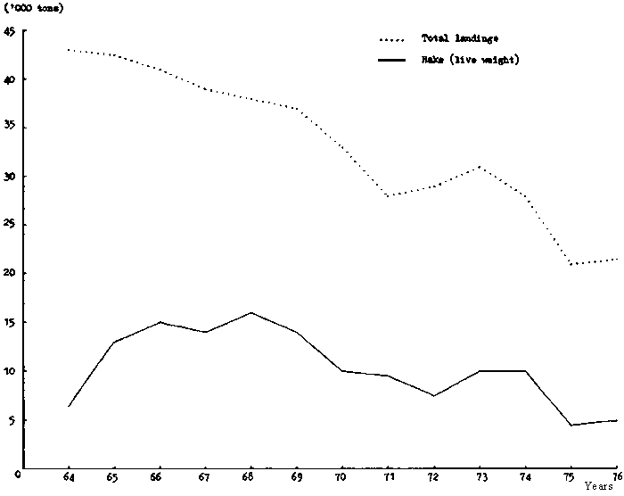 Total landings as well as those of hakes for the Portuguese fleet fishing in the northern zone of the CECAF area for the period 1964-1976 are presented in Table 1 and Fig. 1. Table 1 also contains live weight of hakes. The raising factor used for converting gutted fish to live weight equivalent is f = 1.07.