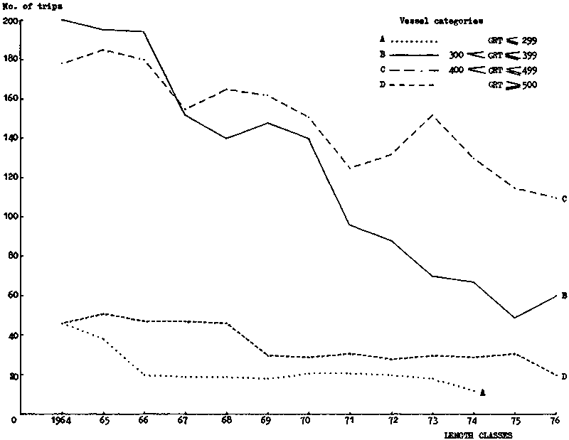 The fishing effort data have also been broken down by vessel categories. These are presented in Table 3 and Figures 2, 3 and 4. Trawlers with GRT below 299 tons were not operating after 1975. It should be noted that main vessels operating after 1975 are between 300 and 500 tons GRT.