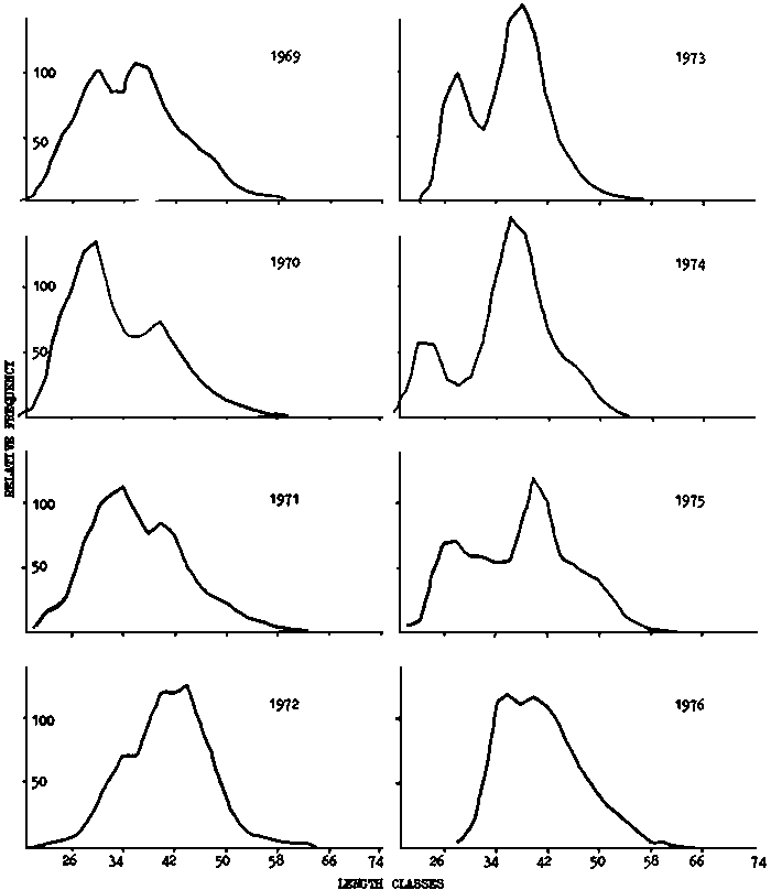 Total length composition of hake landed from 1969 to 1976 are presented in Table 4 and Fig. 5 by 2 cm groups.