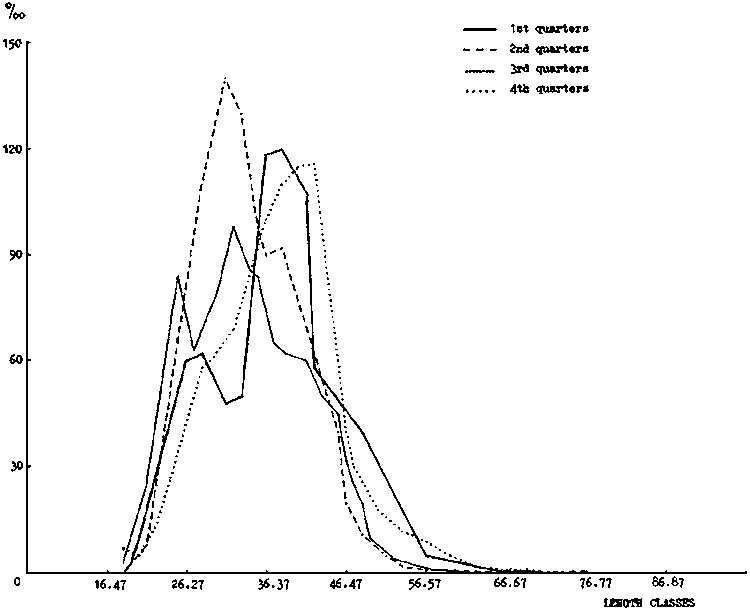 In Table 5 and Fig. 6 are presented length composition data by quarter. (Summary of 1969-1976). In Fig. 6 one can follow quarterly variations in the length distribution.
