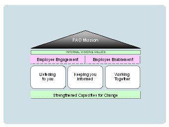 4. In the course of the 2010-11 biennium, the Director-General and Management have continued to strongly support the work of the CoC-IEE. FAO staff have further displayed their steady commitment to the renewal of the Organization and become fully engaged in corporate culture change. A dedicated team has developed a framework for implementing culture change in the Organization, with an emphasis on improving performance.