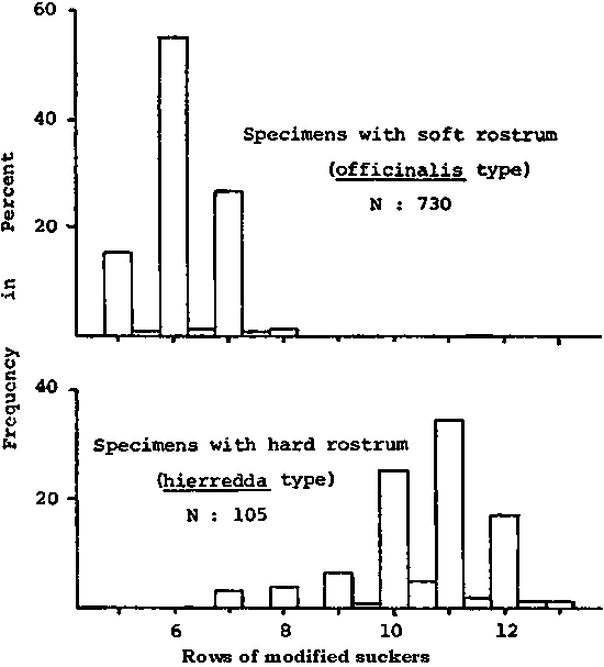 The specimens with soft rostrum have 5-8 rows, whereas the specimens with hard rostrum have 7-14 rows of modified suckers (Fig. 1). Therefore, these two groups could correspond to the northern and southern subspecies reported by Adam (1941). As Sepia filliouxi is encountered only in northern Europe and vermiculata only in southern Africa, the group with soft rostrum was identified as S, o. officinalis, and the group with hard rostrum as S. o. hierredda.