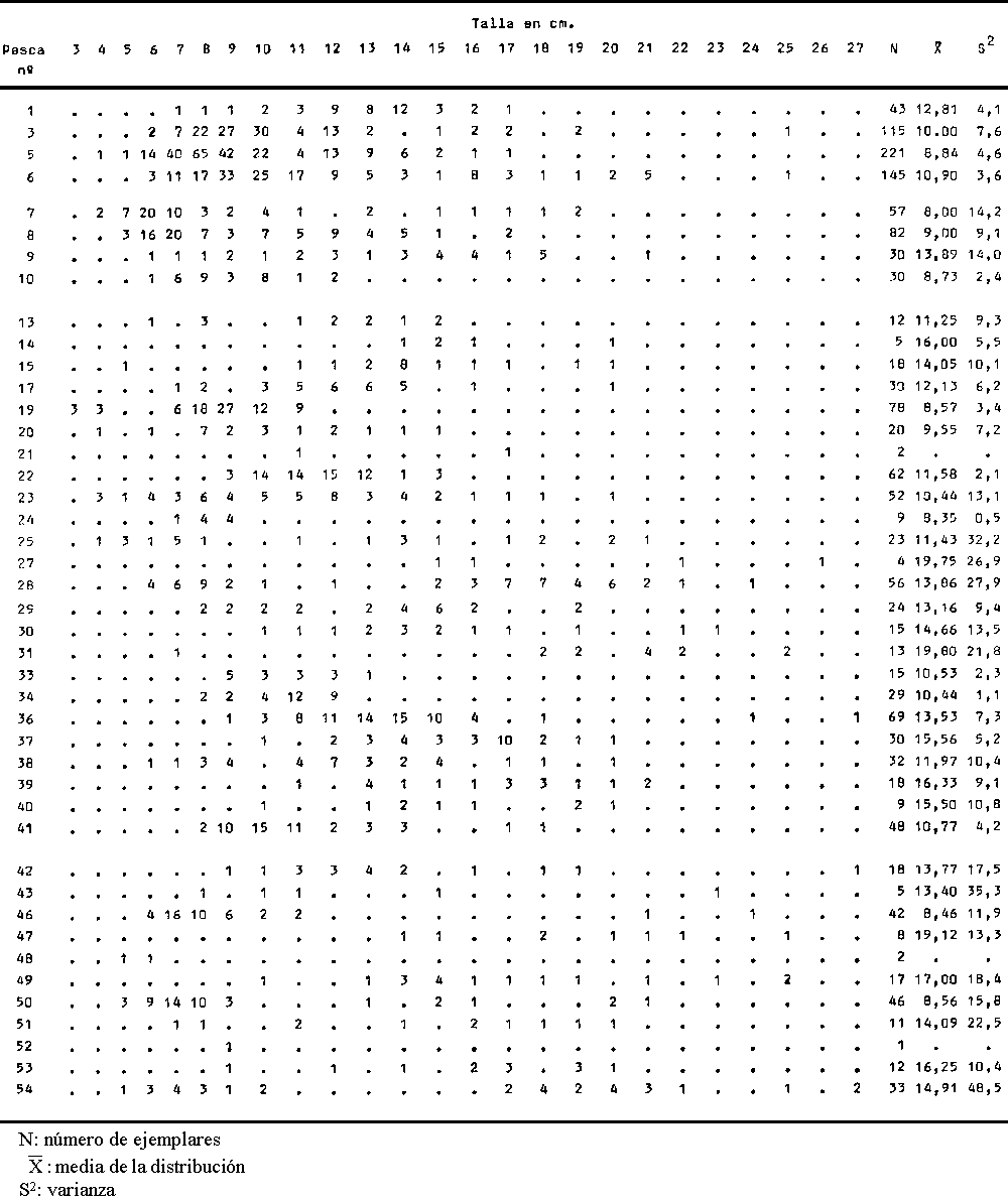 Actualmente no existen datos sobre las distribuciones de frecuencias de tallas para todos los meses de un mismo ano, en base a la información con que se cuenta, en este trabajo se ha procedido a agrupar las distribuciones correspondientes a meses de distintos años considerándolas como pertenecientes al mismo ano (figura 5, cuadro 4).
