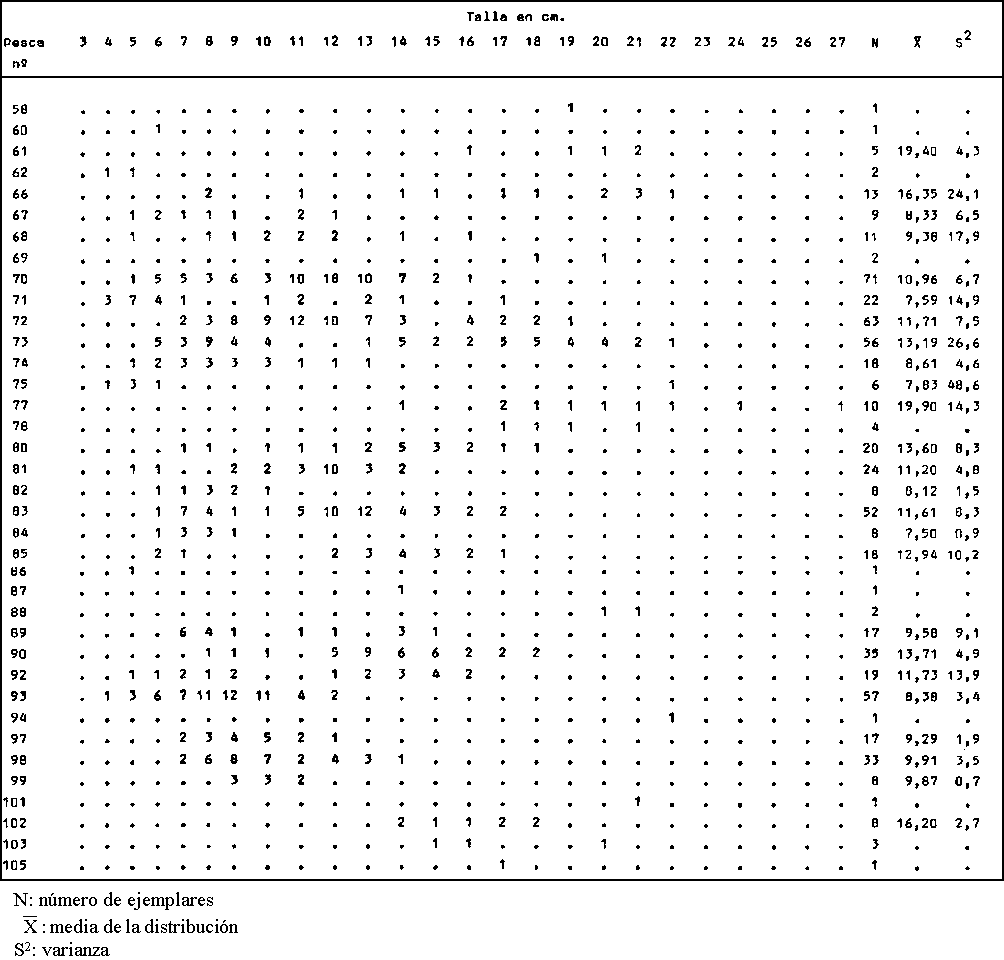 En el cuadro 1 se indican las frecuencias absolutas de tallas de Octopus vulgaris para cada pesca de las campañas del B/O "Cornide de Saavedra".