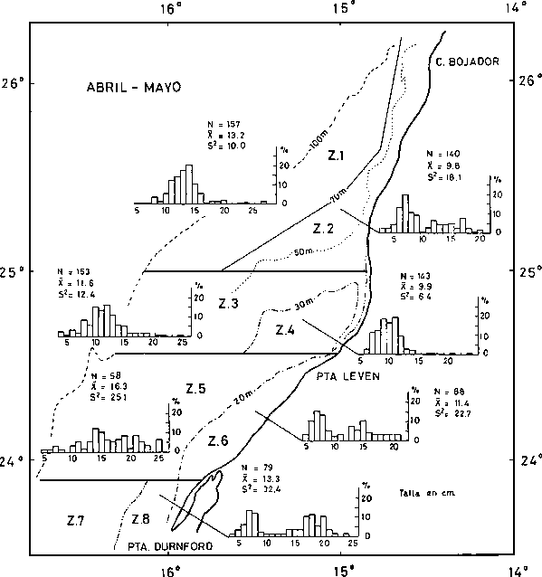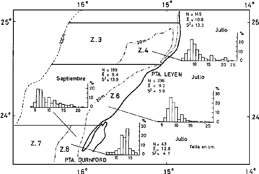 En abril-mayo de 1974 en las zonas más septentrionales del área (Z1 y Z2) se aprecia la existencia de una segregación de tallas, encontrándose además los individuos más maduros entre 50 y 70 m de profundidad. También existe segregación de tallas en octubre de 1975, época en que los individuos de menor tamaño están situados más cerca de la costa que los de mayor tamaño que se encontraban maduros prácticamente en su totalidad. En abril y mayo de 1973-74 al sur del paralelo 25°00'N se encontraron hembras y machos maduros en todas las profundidades, mientras que en octubre de 1975 no se capturó ninguna hembra madura en estas zonas. En ambas épocas la segregación de tallas que se observaba en la zona septentrional desaparece.