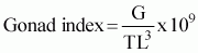 where TL is the total length in mm and G the gonad weight in grains. Por facilitating the measurements, the Needham's sac and the oviduct were weighed together with the testis and the ovary, respectively.
