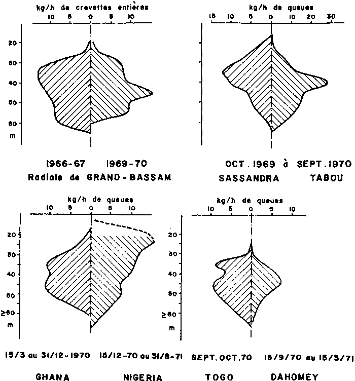 Les distributions bathymétriqnes de tailles et de sexes sont très caractéristiques (Figure 1) et différentes de celles que lon observe dans le golfe du Mexique. Les individus de tailles petite et moyenne occupent les immersions centrales (30-45m) de laire de répartition. Ce sont les plus abondants et leur sex-ratio est proche de la normale. La taille moyenne augmente et labondance diminue vers le large dune part (où les mâles dominent) et vers la côte dautre part (où les femelles lemportent). La distribution bathymétrique des sexes change saisonnièrement, vraisemblablement en relation avec la reproduction. Devant le delta du Niger, en revanche, labondance est plus élevée aux plus faibles profondeurs exploitées (vers 20-25 m).