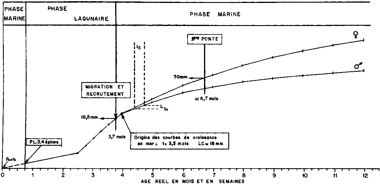En Côte dIvoire le recrutement en mer, estimé à partir du pourcentage dindividus de petite taille (LC inférieure à 22 mm) dans les captures réalisées en mer suit très bien la courbe moyenne annuelle de migration hors des lagunes. Il est maximum de février à avril. Cest également le cas au Nigeria (Bayagbona, Sagha et Afinowi, 1971) et au Gabon (Fontana et Bâ, 1972). La comparaison des cycles annuels moyens de ponte, de migration et de recrutement a permis de reconstituer en Côte dIvoire la chronologie du cycle vital (Figure 2). Si les postlarves qui entrent en lagune au stade 3-4 épines rostrales sont bien âgées de 3 semaines, la grande migration seffectue vers 3.4 mois à une taille de 16 17 mm (LC). Les premiers modes (18 mm, LC) dans les distributions de fréquence de longueur des captures en mer apparaissent vers 4 mois. Le délai entre la migration et le recrutement dans la population exploitée est très court. La taille de première maturité (30 mm, LC en Côte dIvoire) est atteinte ver 6-7 mois. La plus petite femelle mûre trouvée au Nigeria par De Vries et Lefevere (1966) mesurait 28 mm (LC). Les crevettes vivent au moins deux ans.