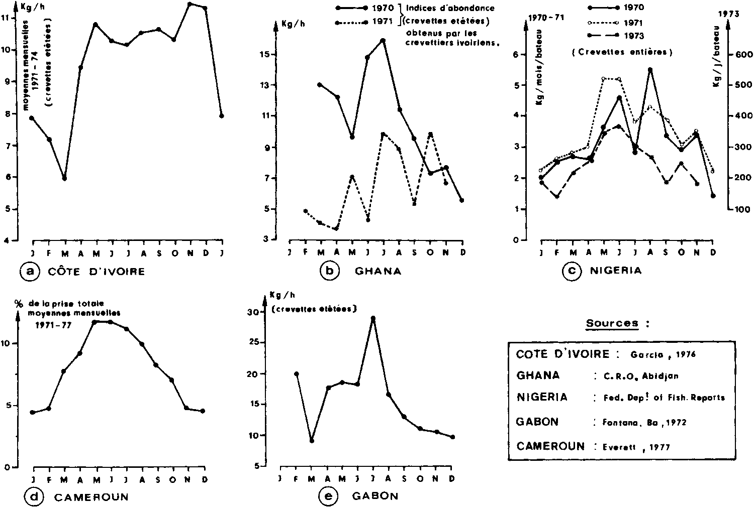 Les rendements au Gabon sont maximaux davril à août (environ 20 kg/h, crevettes étêtées, navire de 650 CV) et minimaux de septembre à mars (10 à 14 kg/h) (Figure 3e).