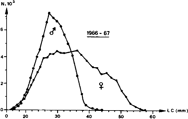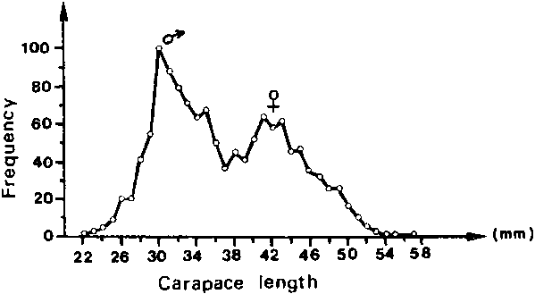 - Lhistogramme annuel des captures réalisées par un bateau de recherche au cours de prospections systématiques réalisées en 1966/67 et 1969/70 pendant une année complète au large de Grand-Bassam. Le mode des mâles est compris entre 28 et 30 mm (longueur céphalothoracique). Les femelles comprises entre 30 et 40 mm sont les plus abondantes (Figures 4 et 5).
