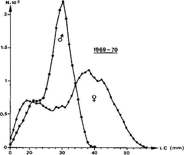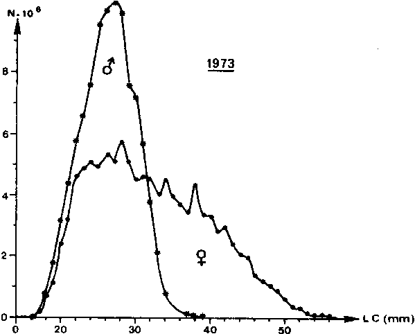 - Lhistogramme annuel des captures des crevettiers professionels en 1973. Le mode des mâles se situe à 27 mm et celui des femelles entre 20 et 30 mm. Le résultat de lexploitation intensive du stock après 1969 apparaît nettement dans le rajeunissement des captures, lequel est plus perceptible chez les femelles (Figure 6).