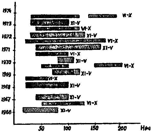 A partir de 1966 on a observé une extension vers le sud de l'aire de répartition de la sardine (Fig. 2). L'accroissement brusque de la biomasse de sardine dans la partie sud de la zone s'explique en premier lieu par le changement des conditions hydrologiques dans cette région, en particulier par la baisse de la température de l'eau. Selon les données collectées par Sédykch K.A. (1975) en 1971-1973, on constate un renforcement des alizés de nord-est et donc des remontées d'eaux profondes (upwelling) décelées par une baisse de la température de l'eau. De ce fait, la température superficielle de l'eau en décembre 1971 - mai 1972 fut en moyenne un degré au-dessous de celle des années 1957-1964.