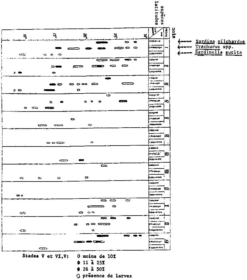Les résultats concernant la proportion des femelles mures sont présentes au Tableau 1 et compares à ceux obtenus pour Sardina pilchardus et pour Trachurus spp. Dans le Tableau 2 sont résumées les conditions générales de la reproduction des principales espèces de poissons pélagiques côtiers dans l'Atlantique Centre-Est.