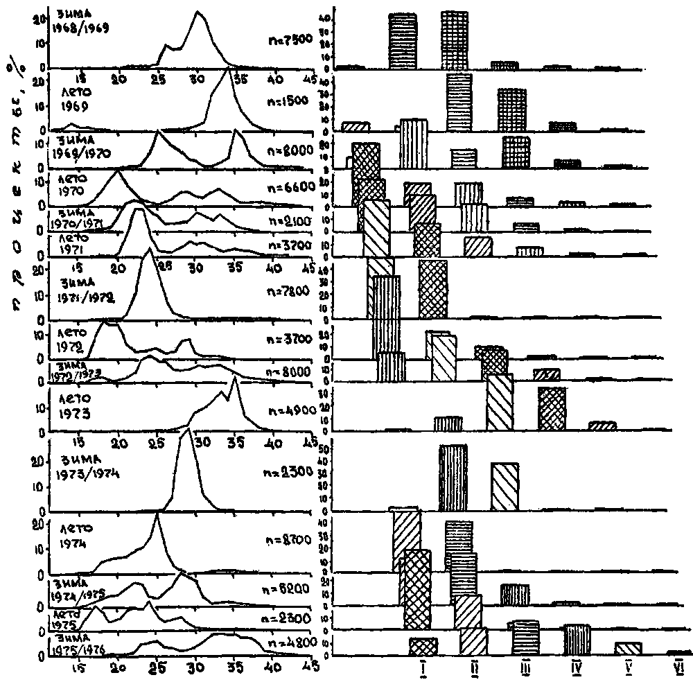 6. Par la méthode des populations virtuelles on a montré qu'il se produit des fluctuations importantes dans le recrutement. La cohorte la plus forte est apparue en 1969-70. Les générations qui la suivaient étaient environ deux fois et demis plus faibles. La classe annuelle 1972-73 a été la plus faible. Ces fortes fluctuations du recrutement ont agi directement sur la taille du stock.