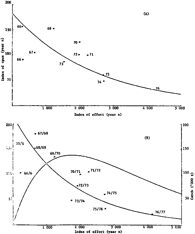 ANALYSIS OF CATCHES, EFFORT AND CPUE'S FOR HORSE MACKEREL (TRACHURUS SPP. AND CARANX RHONCHUS) IN THE SENEGAL-MAURITANIAN ZONE (CECAF DIVISIONS 34.1.3 AND 34.3.1).CALCULATION OF EFFORT INDICES BY DIVIDING THE TOTAL CATCH BY CPUE FOR THE USSR OR BY AN AVERAGE CPUE INDEX