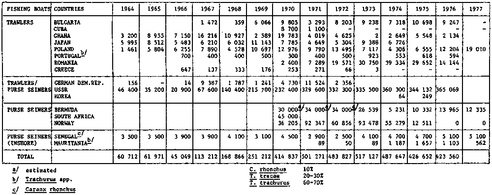 ANALYSE DES PRISES, EFFORTS ET PRISES PAR UNITE D'EFFORT DES CHINCHARDS (TRACHURUS SPP. ET CARANX RHONCHUS) DANS LA ZONE SENEGALO-MAURITANIENNE (DIVISIONS COPACE 34.1.3 ET 34.3.1). CALCUL D'INDICES D'EFFORT EN DIVISANT LA PRISE TOTALE PAR LA PUE DE L'URSS OU PAR UN INDICE MOYEN DE PUE