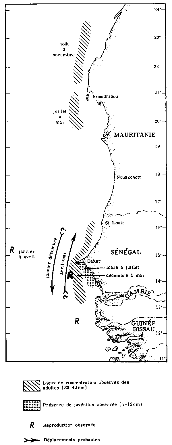 Les schémas suivants résument les connaissances actuellement acquises au CRODT concernant le cycle migratoire, les lieux de concentration et les périodes de reproduction des espèces suivantes pour la zone sénégalo-mauritanienne: