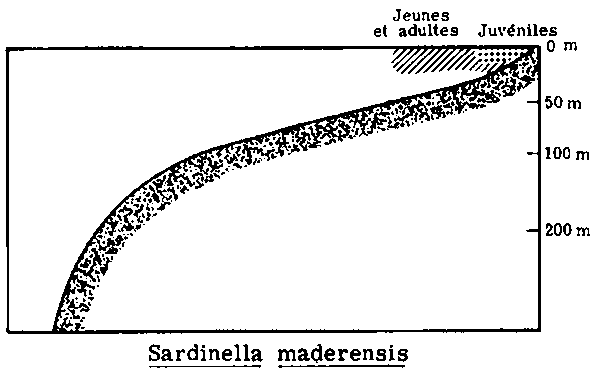 Fig. 7 - Répartition bathymétrique des principales espèces de poissons pélagiques côtiers de la zone sénégalo-mauritanienne