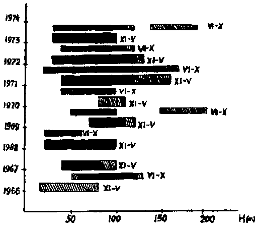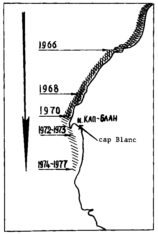 A partir de 1966 on a observe une extension vers le sud de laire de répartition de la sardine (Fig. 2). Laccroissement brusque de la biomasse de sardine dans la partie sud de la zone sexplique en premier lieu par le changement des conditions hydrologiques dans cette région, en particulier par la baisse de la temperature de leau. Selon les données collectées par Sédykch K.A. (1975) en 1971-1973, on constate un renforcement des alizés de nord-est et donc des remontées deaux profondes (upwelling) décelées par une baisse de la temperature de leau. De ce fait, la temperature superficielle de leau en décembre 1971 - mai 1972 fut en moyenne un degré au-dessous de celle des années 1957-1964.