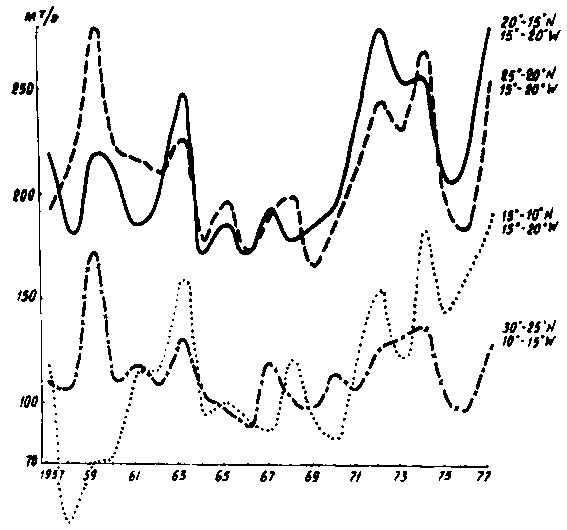 On note que le changement considérable dans lintensité de lupwelling dannée en année met en évidence de fortes valeurs lors des années 1959 et 1963 ainsi quau cours des années 1971-74 (Fig. 4). Au cours des années 1975-76 lintensité de lupwelling a diminué et on pouvait estimer que le cycle sétait terminé. Mais en 1977 lupwelling est de nouveau brusquement devenu plus fort, le début de lannée 1978 atteste que lupwelling est modérément fort entre 20 et 30° N et au sud de 15° N. Entre 15 et 20° N, les valeurs du transport dEkman en janvier-mars sont au-dessous de la moyenne. Ainsi il y a lieu de supposer que le cycle de lupwelling anormalement fort se termine.
