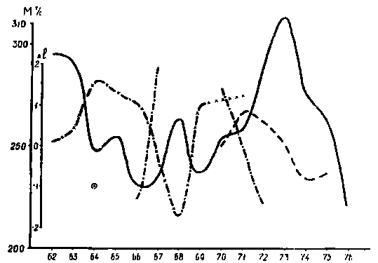 Fig. 5 - Changement de lintensité de lupwelling dannée en année (M-moyenne pour janvier-mars) et celui des tailles à lâge dun an des sardines (ls), du dente à gros yeux (D ld) et du pagre argenté (D lp)s
