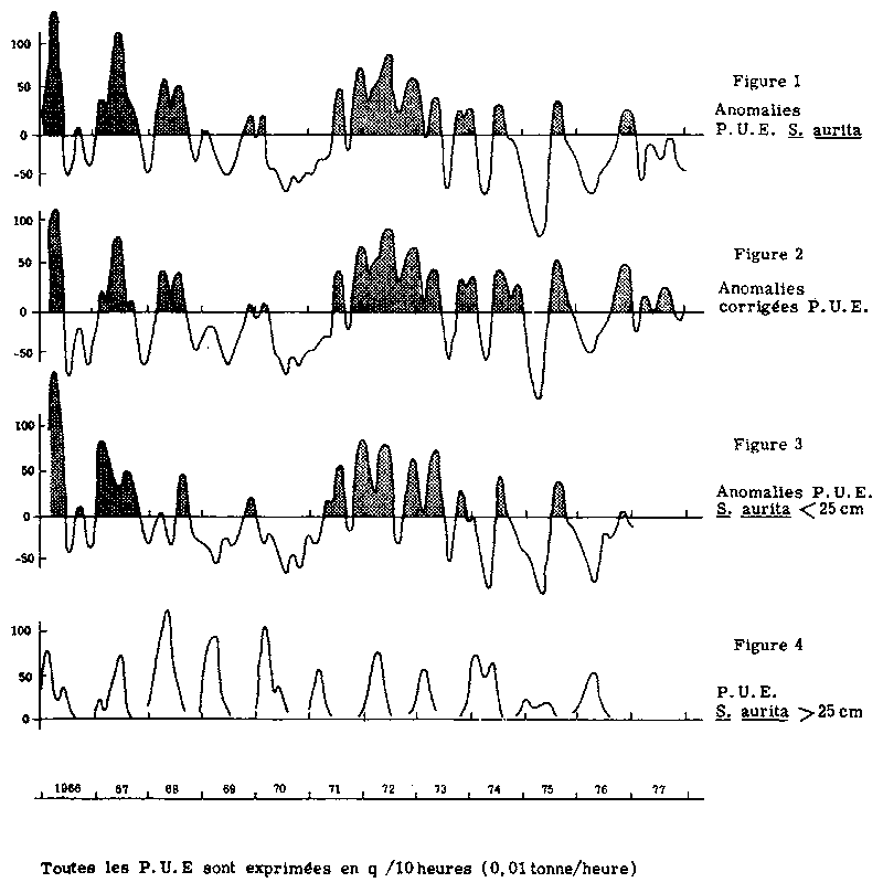 La pêche sexerçant principalement sur deux classes dâge coexistant à des âges différents du cycle migratoire, une séparation de ces classes a été faite par taille. La Figure 3 représente les fluctuations de lanomalie de pue pour les individus de moins de 25 cm, la Figure 4 les pue des individus plus grands. Les rendements sur ces deux classes de taille subissent des fluctuations indépendantes.