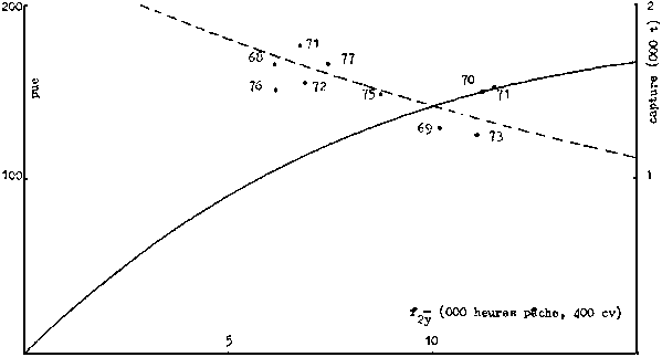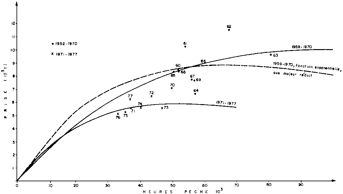 Les données disponibles (tableau 9) sur la pêche chalutière ont permis lutilisation de deux modèles globaux pour lensemble du plateau continental ivoirien, lun pour la période 1959-70, le second pour la période 1972-77 caractérisée par des modifications notables de lécosystème en liaison avec la prolifération des balistes (figure 6a).