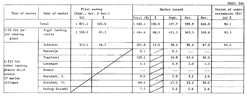 A case where the catch is directly sold to fish dealers seldom occurs at the Tegal landing centre. Therefore, the difference of catch between the fish market record and estimates obtained through the L-II Survey is very small.