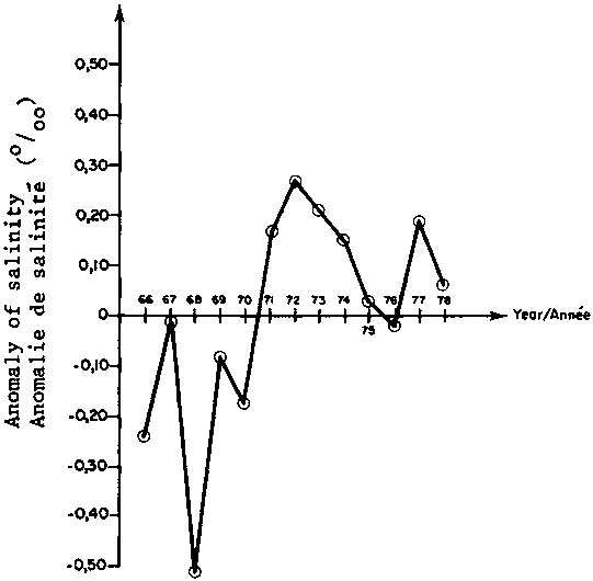 Figure 2 Observed anomalies of salinity at the Abidjan coastal station (depth 5 m) from 1966 to 1973 in relation to mean salinity for the same period - Anomalies des salinités relevées à la station côtière d'Abidjan (profondeur 5 m) de 1966 à 1978, par rapport à la salinité moyenne de cette même période