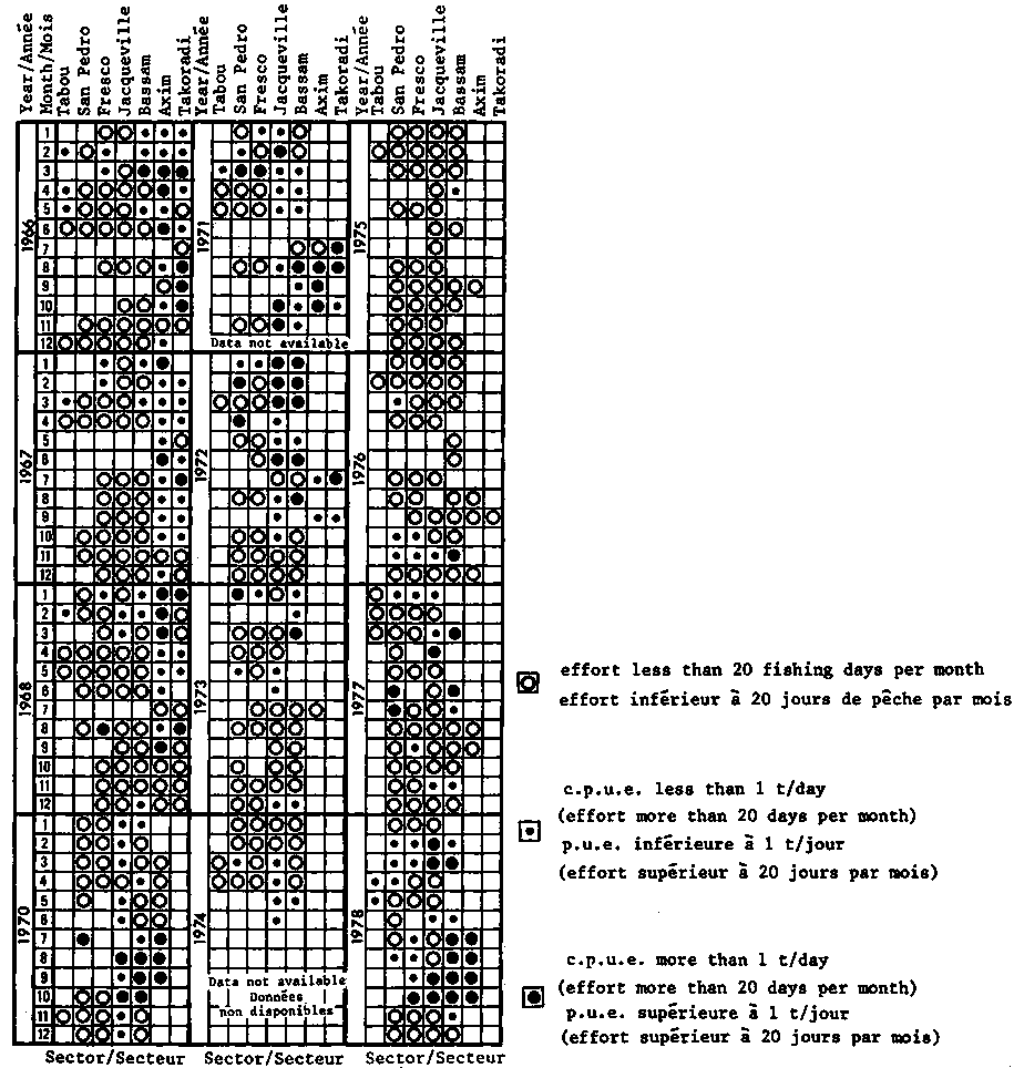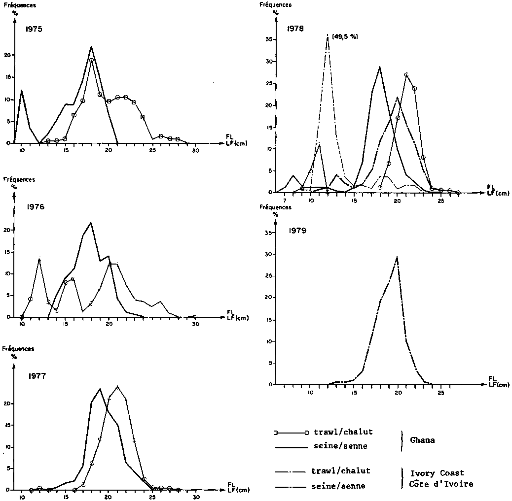Ivory Coast: Sampling data from seiners extrapolated to the total catch figure for 1978; unweighted sampling data from trawlers (1978) and seiners (1979)Ghana: données brutes d'échantillonnage