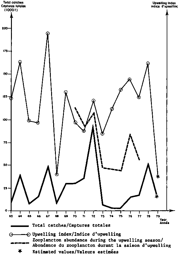 Figure 8 Comparison between the interannual variations of the total catches of Sardinella aurita (Ivory Coast, Ghana, Togo); the variations in upwelling intensity (cf. Table 1); and zooplankton abundance during the upwelling season (cf. Table 21) - Comparaison entre les variations interannuelles des captures totales de Sardinella aurita (Cote d'Ivoire, Ghana, Togo); les variations d'intensité de l'upwelling (cf. tableau 1); et l'abondance du zooplancton durant la saison d'upwelling (cf. tableau 21)