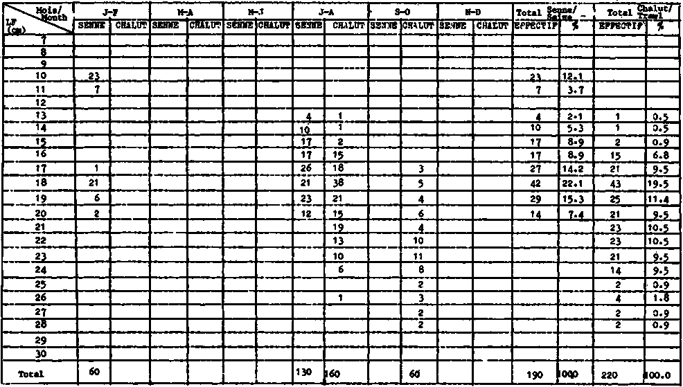 DISTRIBUTIONS ANNUELLES DES FREQUENCES DE TAILLES DE S. AURITA PAR LES SARDINIERS GHANEENS DE 1963 A 1974: NOMBRE D'INDIVIDUS CAPTURES (EN MILLIERS) DE 1975 A 1978: NOMBRE D'INDIVIDUS ECHANTILLONNES (EN UNITE)