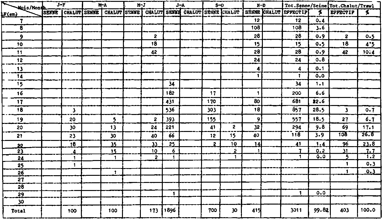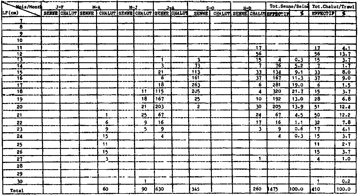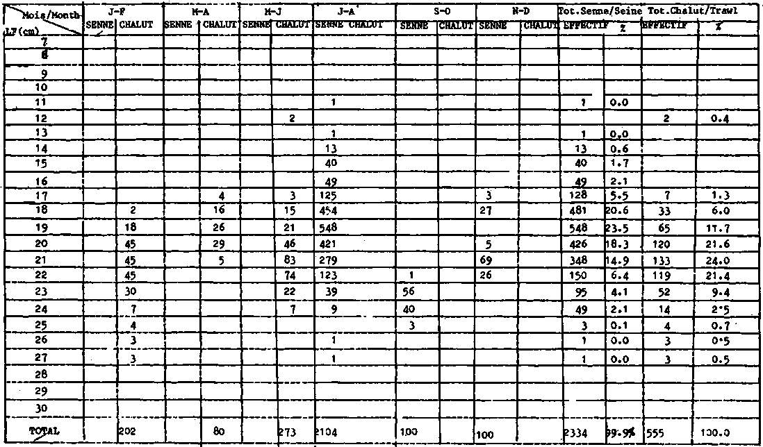 ANNUAL LENGTH FREQUENCY DISTRIBUTION OF S. AURITA IN CATCHES OF GHANAIAN PURSE SEINERS FROM 1963 TO 1974: NUMBER OF INDIVIDUALS CAUGHT (THOUSANDS) FROM 1975 TO 1978: NUMBER OF INDIVIDUALS SAMPLED (INDIVIDUAL FISH)