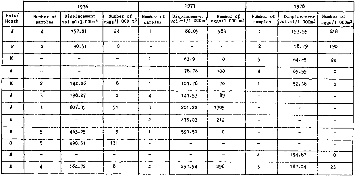 NOMBRE D'ECHANTILLONS MENSUELS, VOLUME DEPLACE DE ZOOPLANCTON ET NOMBRE MOYEN D'OEUFS DE S. AURITA POUR 1 000 m3 D'EAU DE MER, A TEMA AU GHANA