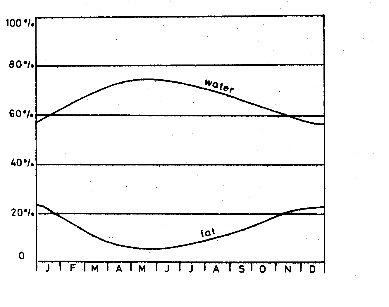 Fatty fish contain most of the fat content in the body tissues and use it as a source of energy. The fat is concentrated in the flesh about the lateral line running down each side of the body and will vary considerably depending upon the time of the year. The herring for example (Clupea harengus ), may have a fat content of only 1 percent immediately after spawning and more than 20 percent at other times when feeding well. The percentage increase in fat content is at the expense of the water content with the protein level remaining fairly constant. Figure 1 shows the seasonal variation of fat and water for the mackerel (Scomber scombrus) in the UK.