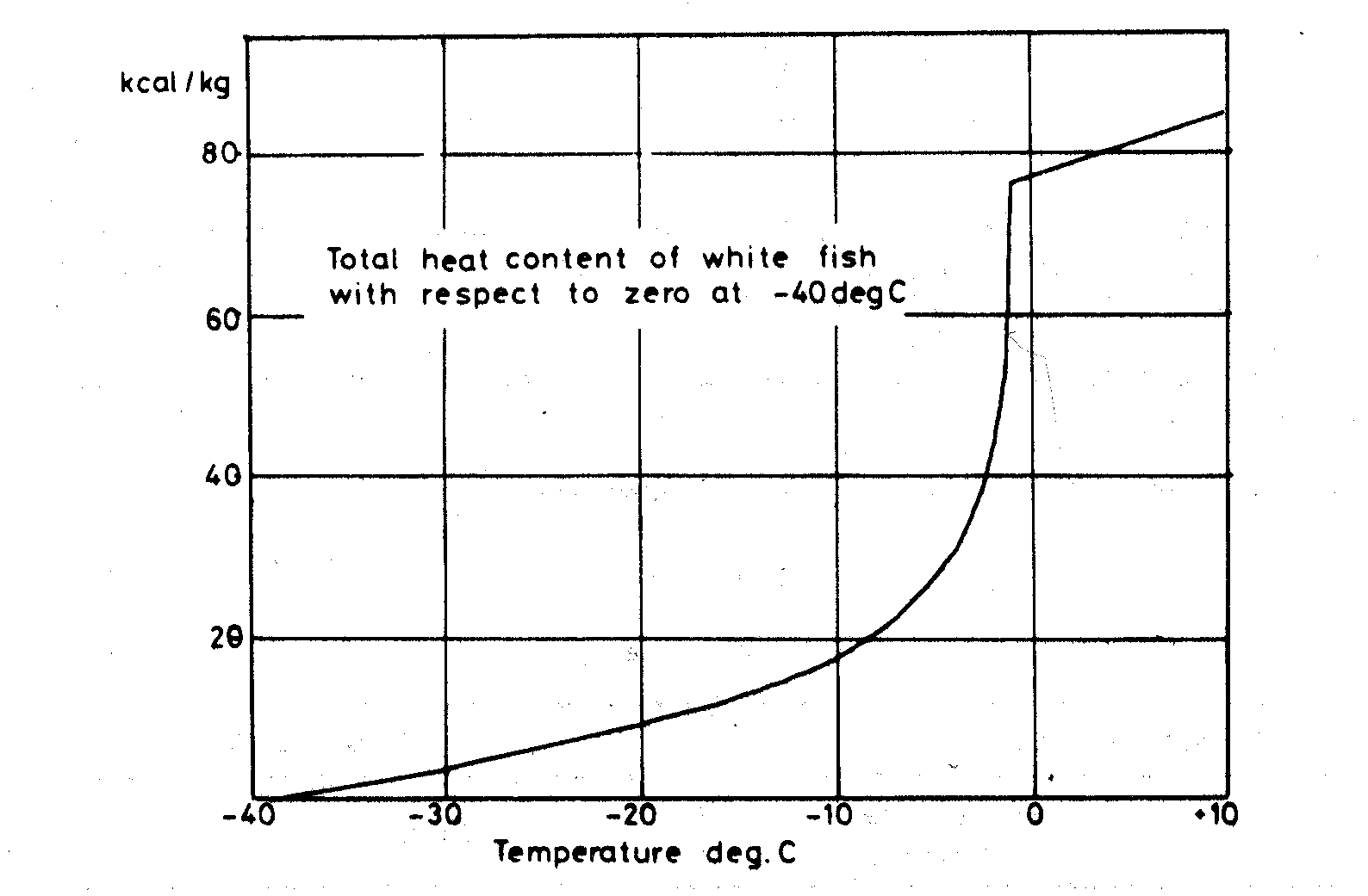 Specific and latent heat values of fish are dependent upon the chemical composition of the fish but for lean fish with a water content of about 80 percent, the specific heat is 0.9 kcal/kgºC for temperatures about -1ºC, the temperature at which lean fish starts to freeze. As freezing does not take place at a particular temperature latent heat and specific heats are removed simultaneously. Figure 2 shows the relationship of total heat content for lean fish taking an arbitrary zero of -40ºC.