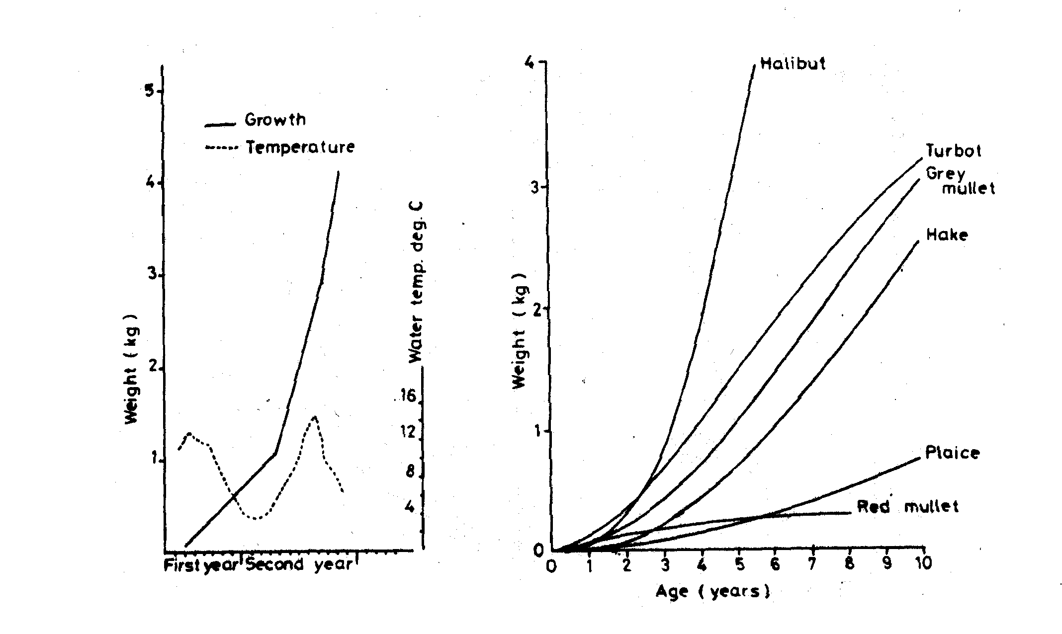 The age-weight relationship of a fish is of particular interest in the husbandry and harvesting of farmed fish and for any given species will depend on the type of feed, the water temperature and quality, the holding method and sex of the fish. As a comparison Figures 5 and 6 show the approximate relationship for salmon, halibut, turbot, plaice, grey mullet, hake and red mullet.